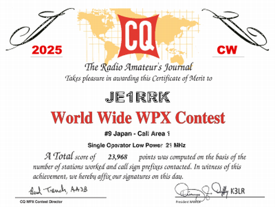 2021年10月受領 SOLPAB 21位/JA1 秋に行われるcq-ww-dx-cwと並んで世界最高のcw-contest。アメリカが主催で、参加する人も多い。 その分、局数やいろんな地域と交信できるが、NUMBERが早い。 更に信号が安定せず、雑音があれば聞き取りつらい。 |