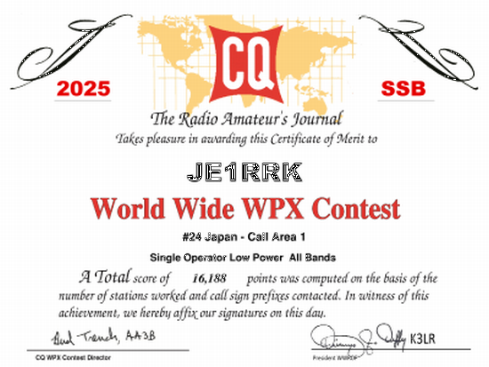 2019年6月受領 SOLPAB JA1で3位 午前のアジアやオセアニアからの信号は、強力なリニアアンプが入っているかの様な強力な信号だった 翌朝のNAとのQSOは、雲海の上での様で、最近に無く素晴らしかった。 |