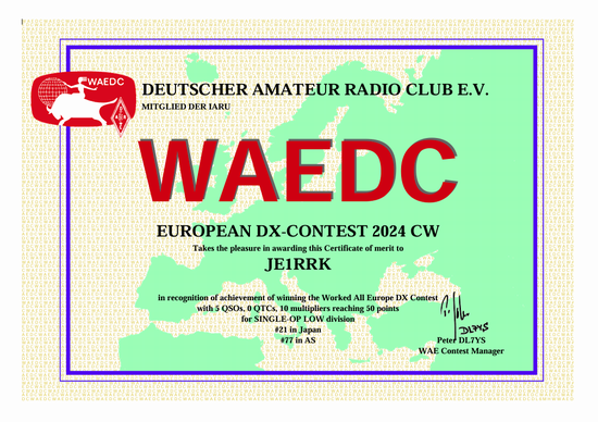 2021年02月受領 多くのcertifyは順位付けがされているが、ARRL発行のこれらはそれが無い。 採点迄済んでいるので順位が付くと尚良い。 |
